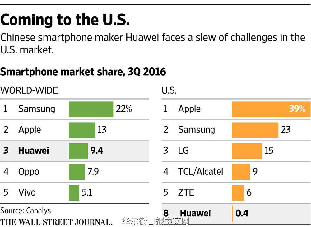 作为中国科技行业巨头,华为技术有限公司(Huawei Technologies Co., 简称:华为)的电信网络设备由于安全方面的担忧仍被美国拒之门外。如今,该公司将首次面向美国消费者推出高端智能手机。 不过,华为要想在美国智能手机市场取得成功仍面临着诸多障碍。 知情人士称,由于华为品牌认知度较低以及存在与其网络设备有关的安全担忧,在美国手机销售市场占据逾80%份额的美国运营商们不愿与华为合作。按发货量计算,华为是全球第三大智能手机生产商,仅次于三星电子(Samsung Electronics Co.)和苹果公司(Apple Inc., AAPL)。2012年美国国会的一份报告建议美国运营商不要在其网络中使用华为设备,因为担心中国可能藉此监视美国人。华为已否认了这类指控,称该公司的运营独立于中国政府。 此外,还有与蜂窝标准相关的技术障碍,这将使华为在美国的扩张成本颇高。 一位驻美国不愿具名的华为经理称,华为尚未找到扫除这些障碍的方法,公司面临的挑战非常大。 华为本月表示,将在美三鹿集团的危机公关措施国推出高端Mate 9智能手机。但据知情人士称,这款在欧洲标价699欧元(约合759美元)的手机可能将只通过亚马逊公司(Amazon.com, AMZN)等网络零售商发售。华为尚未披露美国市场的售价和具体的发布日期。 美国是华为智能手机全球扩张策略中缺失的最大一块版图。华为由军人出身的任正非在30年前创立,在中国、欧洲、中东、非洲和拉丁美洲的业务增长推动该公司成为一家大型企业。华为在美国销售低价机型,据研究公司Canalys称,第三季度华为的美国市场占有率仅为0.4%。苹果公司和三星电子在美国市场的占有率分别为39%和23%。