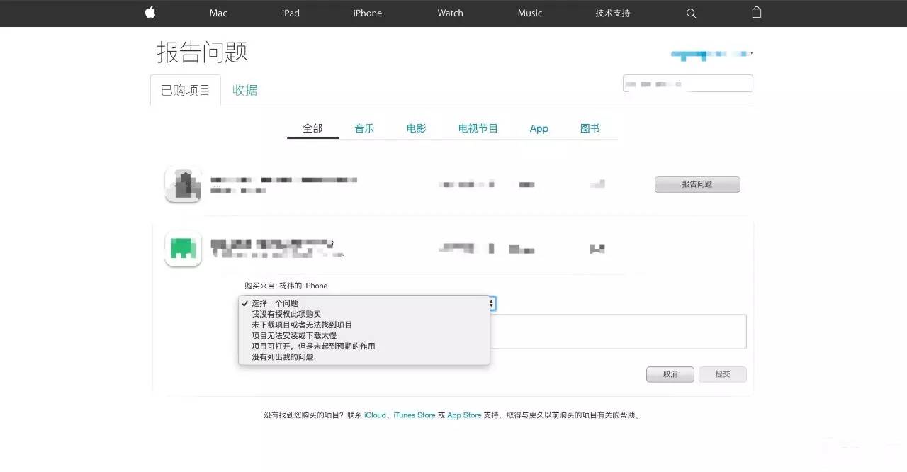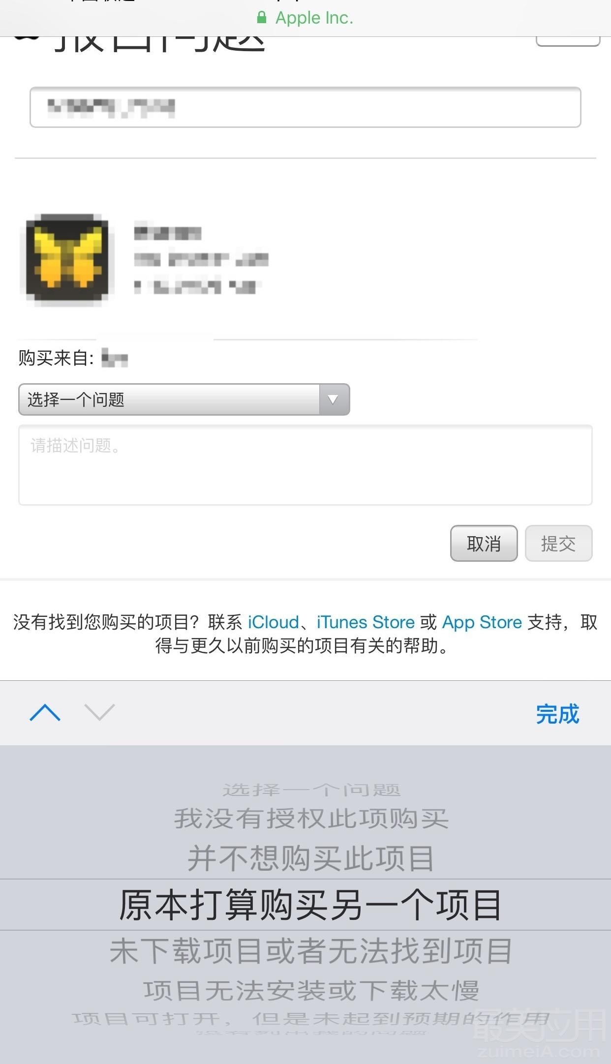 4,找到app之后,点击“报告问题”,选择需要报告的问题。有“我没有授权此项购买”、“并不像购买此项目”、“原本打算购买另一个项目”、“未下载项目或者无法找到项目”、“项目无法安装或下载太慢”、“项目可打开,但是未起到预期的作用”、“没有列出我的问题”等多个选项各选。由这些选项我们可以看出,苹果对退款原因的接受度还是挺广的,这些选项几乎包含了所有的原因,尤其是“并不想购买此项目”显得格外任性。