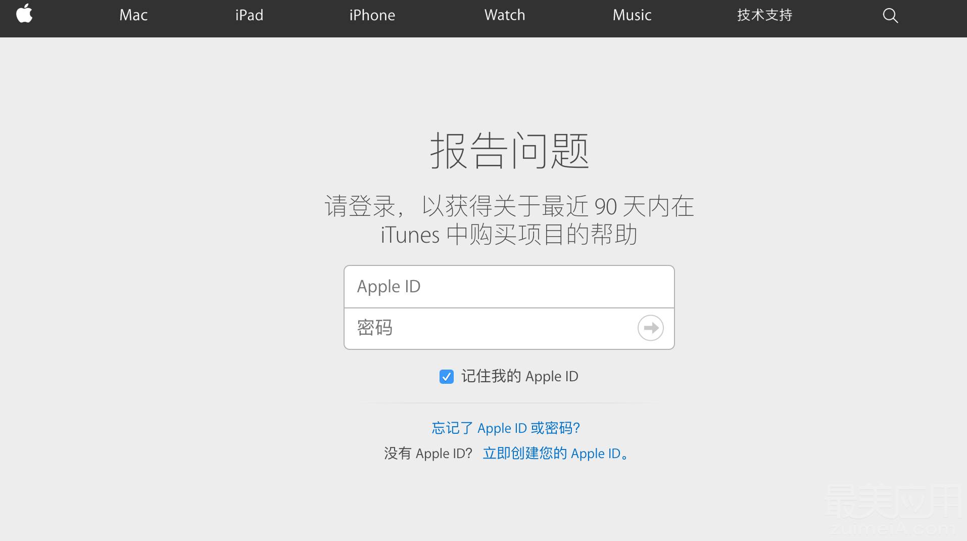 1,打开reportaproblem.apple.com,登陆Apple ID。苹果在此处提示到,“使用您的Apple ID登录,以报告最近90天购买的iTunes Store、App Store、iBooks Store或Mac App Store项目相关问题。”也就是说,App购买超过90天便不能申请退款了。