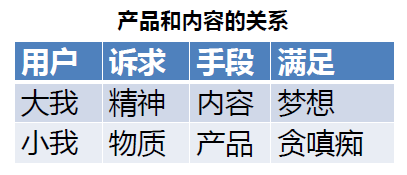 第一步做完之后,我们就要把内容做好。在谈第二部分内容之前,先谈谈内容和产品的关系。内容和产品的关系应该用干柴烈火来形容。 首先,在下方的表格中,用户都有大我和小我两面:小我是指吃喝玩乐的物质层面,大我应该是追求情趣品味的精神层面。 ![]() 与之对应的,我们的产品既要满足用户贪嗔痴的物质需求,同时又要从营销和内容的角度输出梦想,来迎合用户精神层面的享受。然而,明白了用户的需求,不等于能够输出用户喜欢读的内容。你必须向从了解用户需求到说出用户痛点这个方向做出跨越。一般来说,一个正常的人是不会去关注一个企业的social media,如微信公众号、微博,除非企业给到用户一个好处。这个好处有两点,一个是有趣,另一个是有用。 因此,明白了这个用户痛点之后,我们来看看传播方式。以前的传播方式在情感上倾向于说服用户来使用我的产品,告诉用户我的产品怎样的好。然而,现在的沟通侧重于“我知道你需要什么样的产品”,即更加侧重沟通层面的东西。其中的原因是用户对于精神层面的追求远大于对实用性层面的追求。这就是为什么现在越来越多的社会化营销案例说出来的话比你的朋友还要贴心,都是先和你聊一聊、说一说家事,根本不谈我卖什么。对于产品经理而言,在对用户需要什么上把握得比较准,在这一部分是最有优势和最有发言权了。