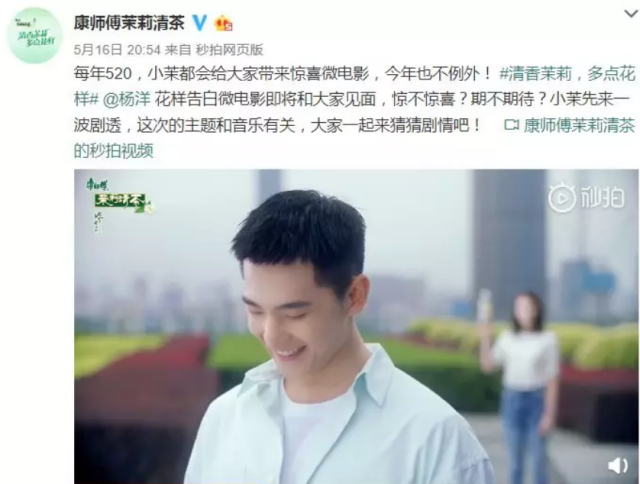 520表白日,既是情侣的甜蜜时光,也是各大品牌借势营销的必争之节。 对于品牌来说,消费者就像是恋人。借势520节日进行品牌营销活动,拉近与消费者之间的距离,往往能起到事半功倍的效果。 因此,在520表白节期间,不少品牌纷纷联合品牌代言人发布宣传片和短视频,向用户深情告白,为品牌的节日营销助攻。 然而在内容为王的时代,千篇一律的小鲜肉告白短视频,已不再被精明的消费者所接受,消费者更加注重的是品牌情感以及产品体验带来的双重满足。在刚刚过去的520节日营销中,康师傅茉莉就联合品牌代言人杨洋,为业界上演了教科书级的节日借势营销案例! 1.线上发布《花样告白》微电影,巧妙植入产品理念 为配合系列新产品上市,康师傅茉莉在5月20日这样一个表达爱意的日子里,携手杨洋打造2019年全新微告白电影——《花样告白》,在各平台同步上映,其中好头缸微博广告。 品牌代言人杨洋在微电影中化身一名小编导,他虽然帮助了100多位观众策划浪漫告白活动,但却没勇气对自己喜欢的学姐告白。