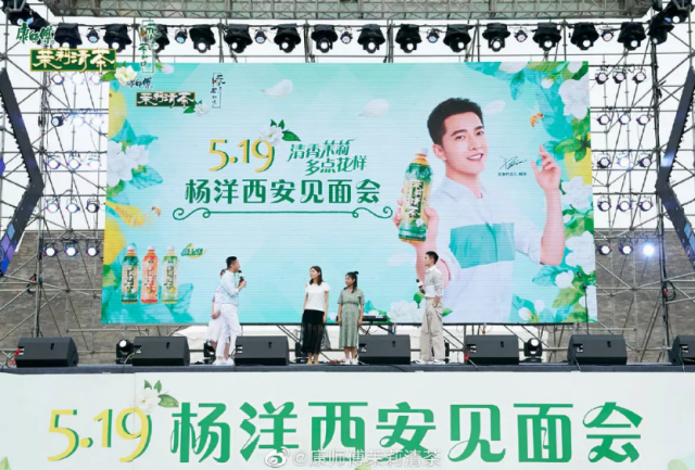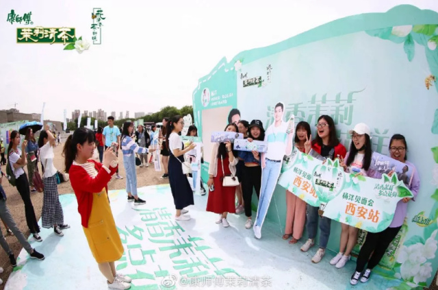 5月20日,茉莉微电影全网上线,瞬间引爆网络。上线当天视频播放量达1.2亿次,让康师傅茉莉在社交媒体高强度曝光。 2.线下召开粉丝见面会,打造沉浸式体验营销 请明星代言是品牌提升知名度、引发用户关注最快的方式,但是一次成功的营销,仅仅凭借明星代言人出演宣传片、短视频,以及局限的线上宣传,不仅难以全方位覆盖目标客户,还无法为用户提供良好的体验,想要实现转化就更难了。 因此,除了打造微电影之外,康师傅茉莉还联合代言人杨洋于5月19日召开了以“清香茉莉,多点花样”为主题的粉丝见面会,通过沉浸式的创新互动玩法,扩大营销活动的影响力。 1. 花样告白互动玩法,现场人气爆棚 5月19日,康师傅茉莉“清香茉莉,多点花样”粉丝见面会在西安玄武门广场召开,代言人杨洋身着清爽白衬衫华丽亮相,干净阳光的寸头造型,清新又不乏一丝帅气,完美诠释了康师傅茉莉年轻化、清新脱俗、优雅的品牌形象。 在活动开始前,康师傅茉莉向粉丝们征集了“告白好物”,设置了告白博物馆、DIY应援、跳告白格子等花样挑战,展现杨洋粉丝“表达爱、分享爱”的“花样告白”实力,也为粉丝制造与偶像花样互动的回忆。 在活动现场,除了粉丝向杨洋“花样告白”之外,还有女粉丝的男友以歌声告白,杨洋作为见证人为情侣们送上美好的祝福。而康师傅茉莉更是为粉丝准备了微电影的精彩片段和康师傅茉莉杨洋定制礼盒等多重惊喜,引发全场粉丝的欢呼。