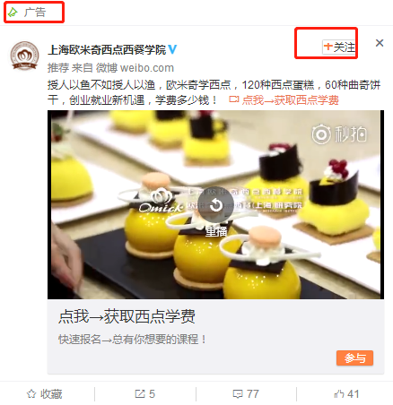 上海欧米奇的这支广告还是比较深入我心的,毕竟我有需求,所以这个广告在这个时间推送给我,也是很恰当的! 上海欧米奇的广告文案,主要吸引人的原因主要有两点: 1、品牌服务 广告主在广告位中直接展现服务优势,用户通过参与培训课程,能够学到120钟西点蛋糕,60中曲奇饼干的制作过程; 2、找准目标受众 学做西点蛋糕的用户一般有两种,一种是学徒还有一种就是创业人士,而广告主这里的广告内容就主要是针对创业人士推出的培训课程。找准创业人士做广告投放,创业人士首先是愿意付出投入成本的,并且参与教育培训课程的费用也是较高的,这也是我们在投放广告时,也需要选择合适有消费实力的目标受众进行广告投放! 总结 无论我们通过微博粉丝通广告是做品牌宣传,还是做招商加盟类的广告,都需要通警察公关危机的意义过广告文案、创意素材来展现出品牌优势和服务优势,在做宣传时,如果能够向用户解释清楚什么我们能够提供什么样的服务,服务有什么优势时,用户也是很乐意关注的! 如果有较好的真实合作案例,我们也可以在广告文案,广告落地页中展现合作的成功案例,也可以让用户直接对我们的推广内容主动咨询。