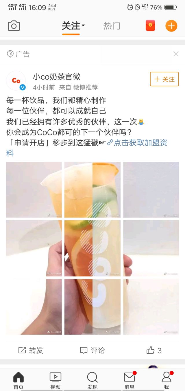 听说CoCo都可奶茶在国外非常受欢迎,很多的外国用户都非常喜欢CoCo都可奶茶,你想啊,老外都喜欢的COCO奶茶,在中国有岂能不受欢迎?而作为CoCo都可的企业,只有扩大规模,多找一些各个地区的合作伙伴才是长久之计,所以CoCo都可一直在各大平台投放一些招商加盟广告,例如:爱奇艺、快手等,这次小编又在微博看到了CoCo都可投放的广告。 费话不多少,先看CoCo都可投放的招商加盟的广告案例。 CoCo都可以对话的口吻写出文案,寻找合作小伙伴,文案中可以读出满满的真挚,触动用户情感。广告的配图选用九宫格的样式图片,旧账图片凑成的CoCo都可销售活动推广音频,你喜欢吗?不知道各位用户有没有被打动?