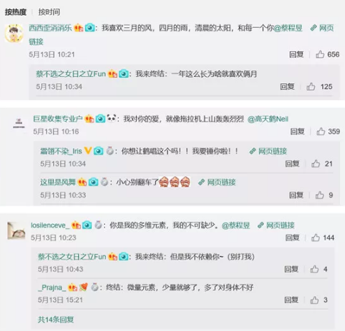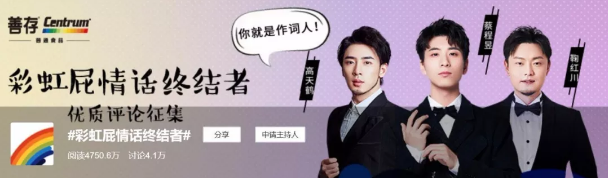 ②“借位”娱乐流量,调动粉丝产出话题性内容 善存普通食品不仅联合流量暖男邓伦担任“彩虹营养体验官”为营养爱情打call,在预热阶段更是找准年轻人流量聚焦点,携手《声入人心》人气成员在线征集彩虹屁情话终结UGC。 “奇葩说”人气选手@飞飞是大王、段子手@微博搞笑排行榜、@精分君、情侣CP@呆十三&@英国报姐,以及腰部微博博主为话题助攻造势,一时间引起网友争相讨论。