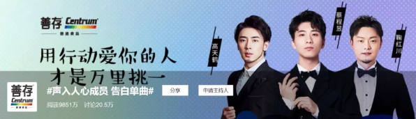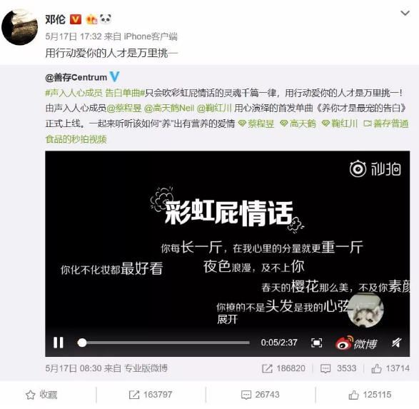 在#声入人心成员 告白单曲#正式上线后,邓伦突然发声,在微博上转发这首告白单曲,将第一阶段的传播效果收束在话题最高潮时期,以此作为营销第二阶段的起点,并且乘胜出击,将阐释品牌态度的“营养大片”全网引爆。