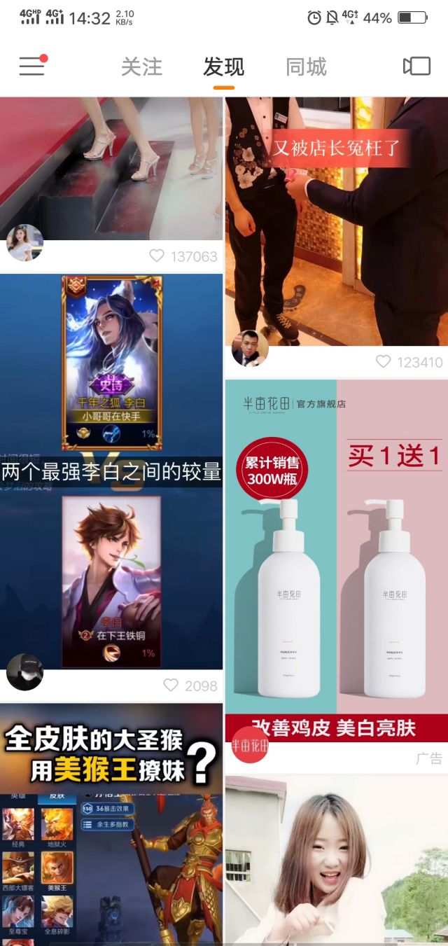 广告出现在用户发现页,我们投放的广告都出现在用户“发现页”,并且带有广告字样,这样,一眼就能看到下图中那个是广告。没错,就是半亩花田了,广告展现在用户眼前的封面图主要针对的是鸡皮皮肤的用户,并且有买一送一的优惠字罗德公关公司样,还有月销多少的数字,封面图上的数字都是使用阿拉伯数字,阿拉伯数字更吸引用户的注意力。