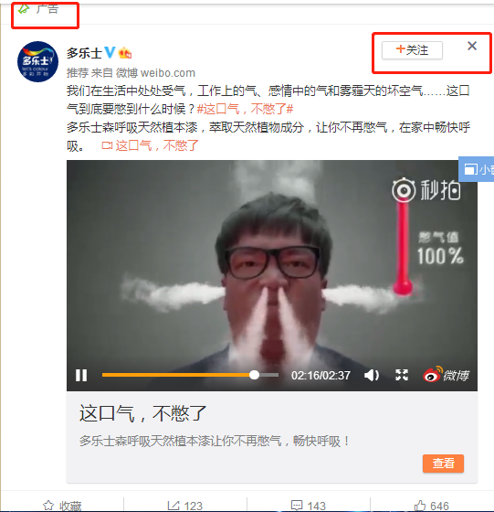 多乐士投放的微博广告,主要是通过情绪对比图,通过人们日常遇到的问题来引发用户情绪共鸣,并给用户提供相应的解决方案,而在这里,多乐士提供的解决方案主要是跟家装行业相关。不过,大家在做家装时,也可以了解了解多乐士精准引流咋引流这个品牌哟~ 好啦,小编带领大家一起进入多乐士的微博粉丝通广告案例分析! 1、广告主是谁? 在图片中,从头像和名称,我们都可以直观的看到广告主就是多乐士,多乐士是一个油漆品牌,而多乐士主要提供的服务就是给用户提供天然无公害的环保油漆产品!这一品牌,在小时候又看到过这个广告,但是随着年龄的增加,对这一品牌的关注较少了。 这个时候,多乐士广告投放,一方面是唤回老客户,也能够通过对产品系列进行介绍,让有家装需求的用户,对这一产品进行关注、了解! 2、广告主的广告创意内容是什么? 广告文案是通过日常生活会憋气在到回到家中畅快呼吸形成的强烈对比。 在广告小程序推广软文创意视频中的内容大概是这样的:从男主出门起,面对生活、天气的折磨,工作、感情上的气,都让男主的生气值达到100,而在男主打开家门的那一瞬间,由于屋内使用的是多乐士森呼吸天然植本漆,男主的所有的怒气值化为乌有,取而代之的就是好心情!好心情的来源就是多乐士森呼吸天然植本漆,在后续的内容就是多乐士森呼吸天然植本漆所含成分、使用多乐士森呼吸天然植本漆的优势、产品信任背书等等! 3、投放微博粉丝通广告后,能够获得哪些优势? 优势一、让多乐士这一品牌在行业中,获得更多用户的关注,也让多乐士森呼吸天然植本漆这一产品获得更多人的关注和产品曝光; 优势二、通过多样化的产品视频展现,可以让用户以不同的形式了解到多乐士森呼吸天然植本漆这一产品,创意视频内容的展现,更有利于用户对品牌、产品的记忆!