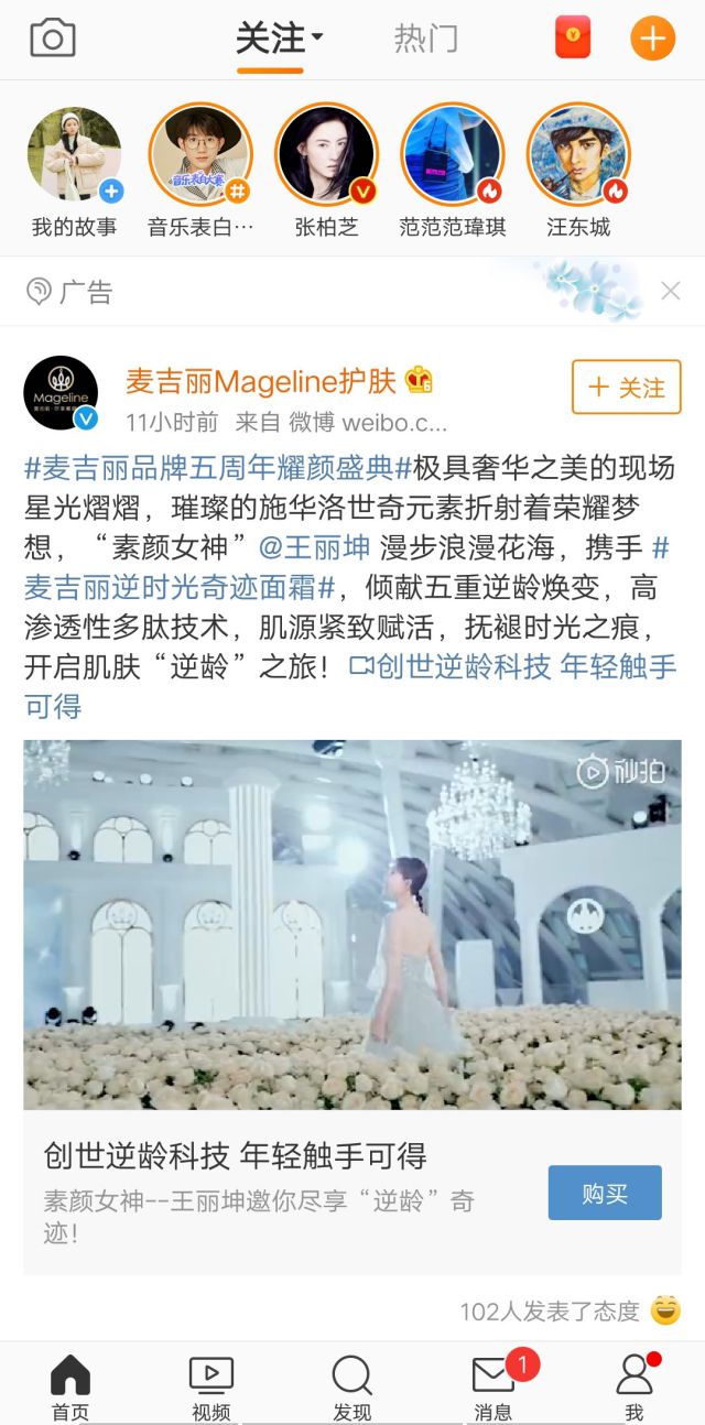 说起来麦吉丽可能大家都很熟悉,毕竟它赞政府危机公关的重要性助了很多电视剧和综艺节目,例如:《中国新歌声》、《奔跑吧兄弟》、《创造营》等高人气综艺节目和《扶摇》、《延禧攻略》等,麦吉丽一直倡导“尽享素颜之美”,不知道赞助的这么多综艺和电视剧里面哪些是最能用“尽享素颜之美”吸引到你的? 好吧,还是小编来说吧,最能吸引我的当然是《创造营》的小哥哥们,每一场都有小哥哥们的口播,看小哥哥们满脸的胶原蛋白,那才真是“尽享素颜之美”。 除了这么多的赞助的综艺和电视剧的广告之外,同样麦吉丽也在线上投放了信息流广告,毕竟现在信息流广告这么火热,麦吉丽怎么可能放过,对于斥巨资赞助,小小的信息流广告的费用可能对麦吉丽来说根本不值什么是线上精准营销一提,只要能做好品牌营销! 小伙伴们都知道王丽坤是娱乐圈的素颜女神,正好跟麦吉丽倡导的品牌形象吻合,所以,自然王丽坤是麦吉丽的形象代言人,这次麦吉丽投放的微博广告主要是推广新品,由王丽坤拍摄的视频短片做广告素材相比很诱人,为产品形象加分,想要逆龄焕变就要点击视频右下方的“购买”链接,进入到广告的落地页。