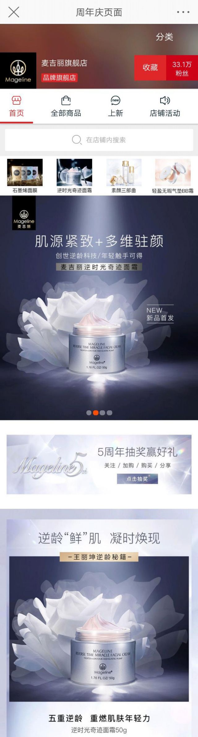落地页直接跳转至麦吉丽的天猫店铺,本次逆时光奇迹面霜是新品首发,所以店铺的首页只要以面霜为主,全面曝光新品,增加新品销量和曝光率。 麦吉丽之所以在微博粉丝通投放广告,因为赞助的综艺节目和热播等,用户感兴趣的话题一般都在微博,除此之外,微博用户的参与度高,用户更活跃,产品短时间内可以得到快速的曝光。
