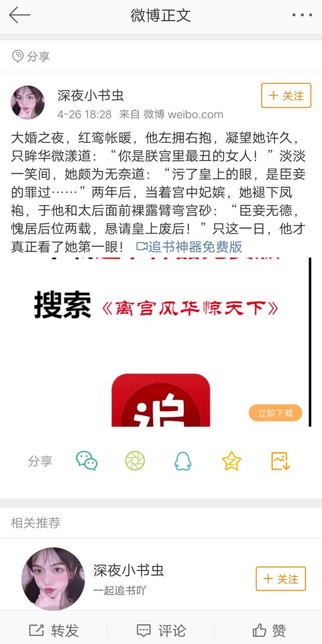 小说类型的APP虽然市面上不是说泛滥成灾但是还是有危机受害者公关对策不在少数的,小伙伴们看小说最讨厌的一种感觉应该就是看着正精彩的时候突然小说要收费了,要么需要充值会员,要么付费看第几章或者看全集,这种感觉真的很不爽,小编以前遇到这种情况都直接放弃等更新,久而久之就把小说忘到脑后果断弃书。 所以说,如果能遇见可以免费看热门小说全集的APP那一定很受书虫们的欢迎,今天小编在刷微博的时候看到一款不错的APP,不仅可以免费看小说还可以看小说赚钱。 这条广告的广告主是追逐神器免费版投放的微博粉丝通广告。