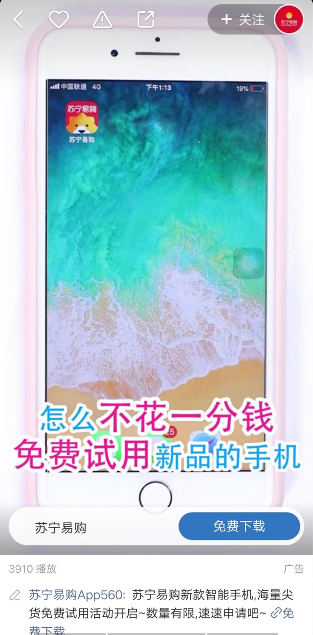 广告的外层用免费领手机的形式吸引用户,而且0元就可以免费试用手机,试用的手机是realme X,realme在本月的15号首次回国,在北京举办发布会,很多人都想试玩一下realme手机尝尝鲜,但毕竟自己已经有一部手机也不至于再买一部手机,所以免费领取realme手机对用户来说还是很有吸引力的。 进入视频的播放页,主要是教用户如何免费领取的步骤,凸显活动的真实有效,吸引用户下载苏宁易购参与领手机活动。