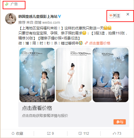 当新一代宝爸宝妈们成长的时候,会用相机记录下宝宝每一个精彩瞬间! 我们可以通过移动设备来进行拍照留念,也可以找到专业的摄影机构来进行写真拍摄留念。 儿童摄影在投放广告时,都会投放微博广告,广告主们选择的营销渠道更多的是热门页信息流广告,假装热门,也可以引起对热门感兴趣的用户的关注~ 今天小编要跟大家分享的广告案例还是韩国童感儿童摄影投放的微博粉丝通广告!如果你想要投放婚纱摄影行业的微博粉丝通广告,如果你想要找一个靠谱的儿童摄影机构也可以考虑考虑韩国童感摄影!