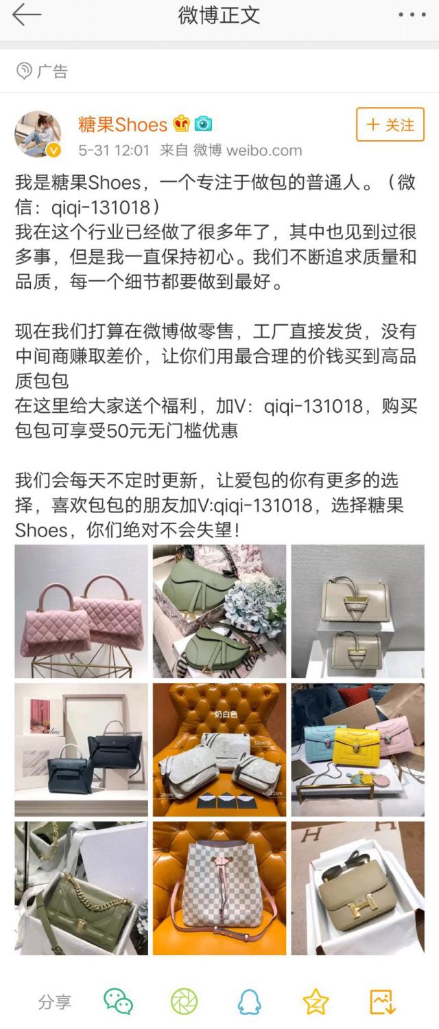 “包”治百病,在女生的世界里,想要治好女生的病很简单,没有什么是包包和口红解决不了的,“破财消灾”男生都懂的吧。 经常刷短视频的你肯定看到过有很多视频都在讲男生怎么哄女朋友,办法无非就两种最通用,一种是口红,一种是包包。 一个著名的明星袁咏仪曾多次在节目上说自己看到包包走不动,自己看上的包包不买到不罢休,可能女生都是如此吧,所以男生们get到这个点了吗? 小编在微博看到一条包包的广告,投放广告的广告主是糖果Shoes,投放平台是微博广告,看看以下广告案例。 广告的文案使用的是广告主的自述,用自述拉近与用户之间的距离,获取用户的信任和认可。包包使用自产自销没有中间商赚差价的优势获得用户的好感,让用户对产品的质量和价钱认可。