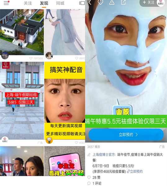痘博士的案例小编也有分享过很多次,活动也有不同的活动,也有不一样的借势营销点,这次痘博士投放的广告主要以端午节为主,端午节小伙伴们都放假了,相信有很多的小伙伴都有时间吧,不如先看看案例分析。 痘博士的广告一直都可以在看到这次也不例外,广告的封面用的是用户去痘博士的场景图,封面上的文字突出节日活动,并且只要5.5元用户就可以享受痘博士的祛痘套餐,时间仅限3天,限时优惠增加用户的积极性。