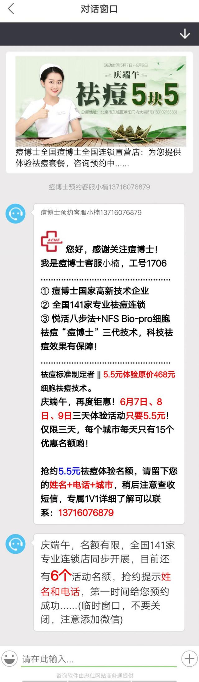 点击立即预约,跳转到广告落地页,落地页直接跳转到在线客服页面,用户可以将报名所需信息发送给在线客服或者有什么疑问也可以发送给在线客服,自然会有人会解答,这样以来,可以增加用户的转化率。落地页中反复强调活动时间以及活动费用。并且用特殊字体增加用户的紧张感,提高用户的积极性。 痘痘肌的用户对祛公司公关危机公关痘的产品都会非常关注,在上海5.5能干什么?对于5.5而言,用户更愿意尝试,广告的外层文案针对上海地区的用户,所以可以确定的是广告主在投放广告的时候选择设置投放区域,针对上海长度的用户投放广告用优惠的方式实现线上引流客户到线下门店,提升门店的客流量。
