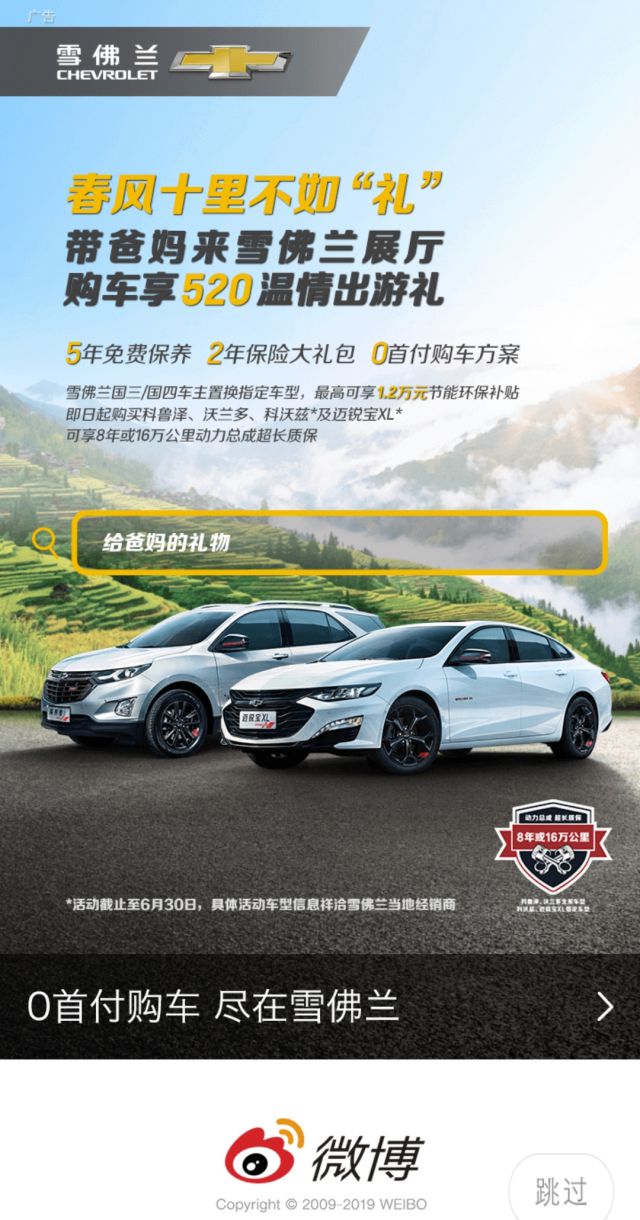 雪佛兰是通用汽车集团旗下的最大的品牌,如若按照汽车生产量计算,雪佛兰能算得上是世界上最成功的汽车品牌,之所以做到这个高的生产量,也是因为用户的需求比较高。 用户的需求高源于品牌做的好,知名度高,雪佛兰经常投放广告,小编今天还看到雪佛兰投放的微博开屏广告。 首先,开屏广告有很多优势: 1.海量曝光广告 2.对用户的干扰小 3.增强品牌在用户心里的记忆度,有效的抓住用户的眼球,更好的吸引用户 哪些行业适合投放微博开屏广告? 1.汽车行业 2.化妆品行业 3.手机行业等 因为开屏广告互动性不强,投放开屏广告用户不能对广告进行评论、点赞、转发等行为,所以适合做,不是所有行业都适合做开屏广告,例如婚纱行业就不适合做开屏广告,婚纱行业适合投放比较原生的微博信息流广告,图文样式更适合展现。 而雪佛兰投放的广告,则是大感情牌,送给爸妈的礼物,并且还有5.2.0优惠活动都展现在开屏广告的海报上,虽然看起来文字有些多,但是重点部分都有特殊颜色,用户第一眼就可以看到重点部分优惠信息再加上车的展示图更加吸引用户。