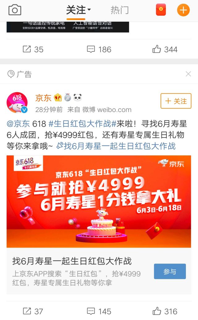 离京东618越来越近,京东广告力度也在一直在加强,起初只是看到一些平台的信息流广告,然后每天下班回家的时候坐在电梯里,电梯里也都是京东的广告以及地铁站的大屏幕还有车厢等地方,感觉到处都是京东的身影,一波又一波的广告,火箭少女也跟着大火了一把。 无论线上线360信息流广告投放下,京东的广告到处可见,这波整合营销做的666!今天小编在微博看到京东的广告,这词是推广618用户可以得红包的活动福利,先看广告案例。 京东官方投放广告,推出“生日红包大作战”活动,寻找6月的寿星。6个人一起成团就可以抢价值4999的红包,同时还有寿星的专属的生日礼物可以拿,用户也可以在京东APP上搜索“生日红包”参与。
