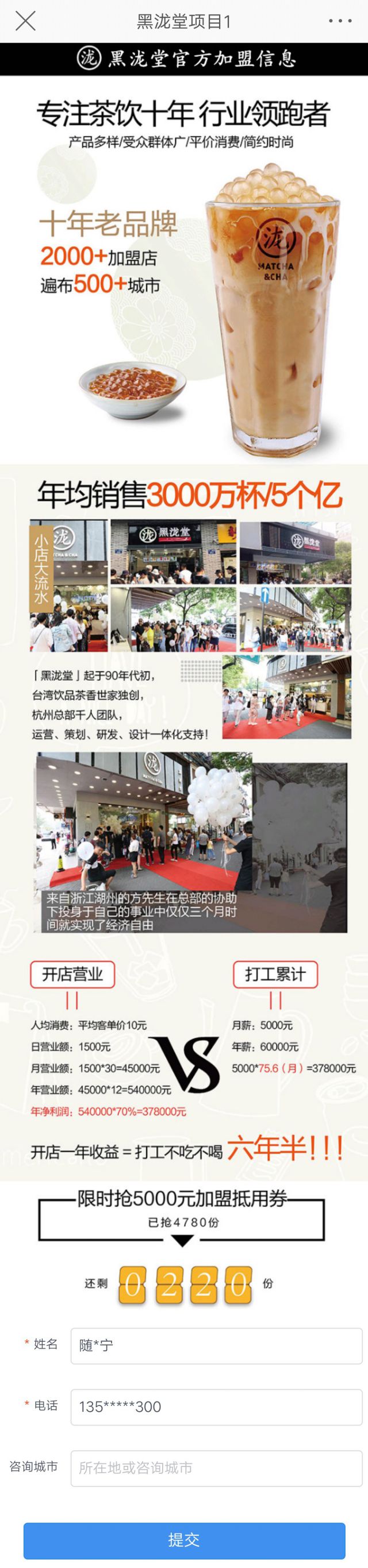 落地页: 点击进入广告的落地页,上方展示产品以及店推广营销产品的销量,用数字吸引用户,让用户的心理产生加盟的萌芽,并且还有5000元的加盟抵用券限时抢购,还显示一枪了多少份的信息,用户需要填写下方表单才可以领取,领取大额的抵用券之后间接的刺激用户转化。