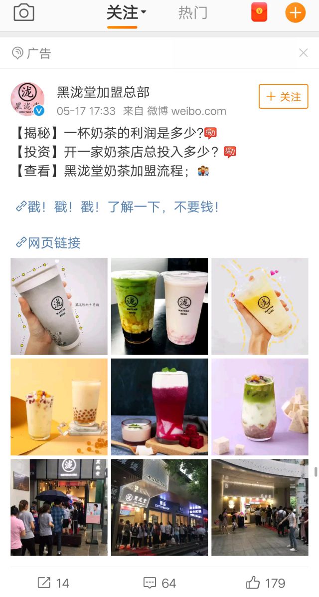 黑泷堂奶茶也是家喻户晓的奶茶品牌,奶茶所属的行业也在迅速发展中,很多品牌都打着网红奶茶的旗号招商加盟,奶茶的种类和口味繁多,这个行业的疯狂竞争也让奶茶越来越有创意,不光如此,奶茶的颜值也变的越来越有创意。 奶茶可以现做现卖、冷热也都可以,用户及时消费,除此之外,奶茶店也不止只有奶茶,还有果汁等产品,可以说一年四季没有淡季,也非常受消费者青睐。 奶茶这么畅销,黑泷堂奶茶的压力也更大,所以在微博投放招商加盟广告。 广告的外层: 广告的配图使用九宫格的形式,其中6张图展示产品3张图展示客流量,吸引用户。广告文案使用两个问句代表用户心理的疑问,最后是加盟流程,引导用户戳链接进入到落地页。
