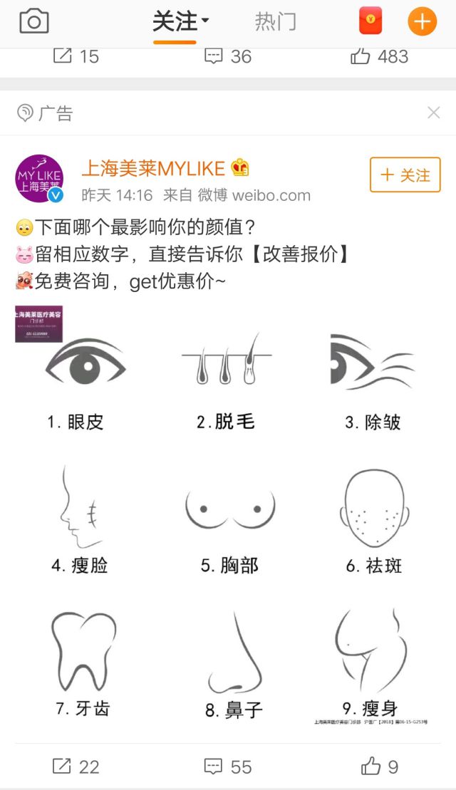 上海美莱是国内最早从事医疗投资的集团企业,也是国内规模最大的整形医院连锁之一,生活质量的提高推动美容行业的发展,俗话说“爱美之心,人皆有之”,生活水平提高之后,许多用户不仅对化妆品有讲究,一股整容整形的热潮也在涌动。 正是因为如此,整容整型以及美容行业快速发展,而上海这座大“魔都&rdquo营销策划和活动策划;,整容整形的品牌不在少数,想要获得用户还是少不了推广,所以上海美莱选择投放微博广告。 广告外层使用疑问的方式“下面哪个最影响你的颜值?&r代运营 网店公司dquo;吸引用户,抓住用户痛点提出问题更容易引起用户共鸣。引导用户参与互动,留言评论,增加评论区的活跃更吸引潜在用户的关注。 广告的配图使用大图展现,每个小图标代表一种类型并且标有数字,供用户在广告下方留取数字找对应烦恼,也能让广告主了解用户的基本需求,并且在广告后台也能分析目标人群的特征。