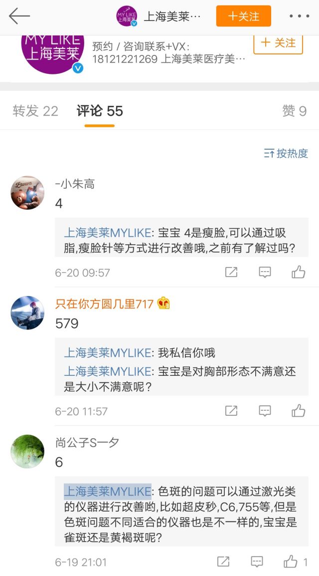 广告主在投放广告的账户简介放上了联系方式,用户看到广告后想直接联系可以通过电话或者微信的方式直接提出疑问或者预约。 广告文案引导用户留言,所以用户在广告下方留言之后我们需要及时跟用户回复沟通,拉近与用户之间的距离。 微博粉丝通的计费方式有两种,CPM和,在这里,广告主可以用CPE的收费方式,即根据有效互动计费,有效互动包括转发、评论、点赞、关注等用户行为,可以有效的降低广告预算。