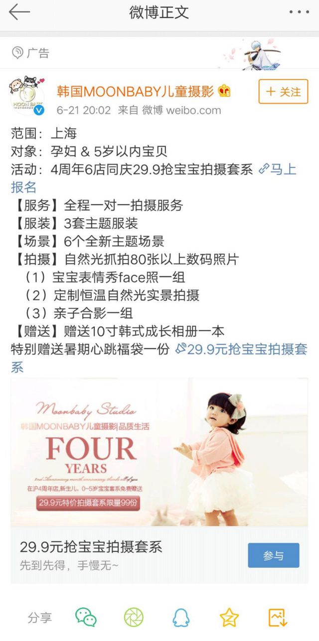 新晋宝妈大多都是宝宝控,尤其是90后宝妈,有了宝宝之后更是晒娃狂魔,不仅如此,现在在短视频平台抖音快手上也经常能看到很多宝妈晒的宝宝视频,一般晒宝宝的视频拍的好的播放量高达百万,还有几岁孩子就当网红的,如山东公关公司今短视频时代,家有萌宝也是非常有意思的事情。 宝宝都这么吃香了,可见各位宝妈都是非常宠爱宝宝的,哪个家长不把自己家孩子视若珍宝?更是向记录孩子成长的点点滴滴。为孩子拍美美哒的照片在孩子长大之后也是孩子成长最珍贵的礼物。 韩国moonbaby儿童摄影投放的微博广告,专注与孕妈与5岁以内宝宝的拍照服务,本次投放微博粉丝通刚刚推广活动招募更多用户到店转化,增加店铺客流量。 广告直接了当,文案是发布活动的内容,有活动范围、活动参与对象、活动以网络营销和推广及活动的服务、服装、场景以及拍摄,还有礼品赠送,看完全部的文案活动信息再看看广告的配图是一张萌娃的照片更心动了,而且活动费用只要29.9元,在上海29.9元能干什么?买两杯奶茶或者喝一杯咖啡,对所有用户来说都是在接受范围之内的。