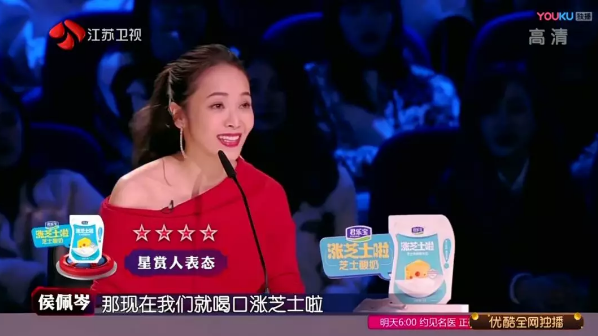 “涨芝士啦”之所以与多款综艺霸屏联动,一方面是看重了这些综艺的潜力,想借助大媒体、大平台的组合势能形成超高曝光度,迅速在消费者心中赢得良好的品牌占位。另一方面,高举高打的营销策略也向大众展示了“涨芝士啦”的雄心与信心,凸显出品类领导者的王者风范。 2.花式植入:多元演绎形成记忆符号,深度捆绑强势带货 在这个观众注意力极度稀缺的时代,简单粗暴的植入注定沦入炮灰。而君乐宝除了精心挑选合作IP以外,在具体玩法上也下了不少工夫,也正是这些多角度、全方位的植入,才让产品与综艺IP实现高度融合,从而占领消费者的心智。 就拿在《百变达人》中的植入玩法来说,除了在舞美、场景中的自然露出,在“关键时刻”的内容植入同样赚足了消费者的眼光——节目中最惊险的时刻、最动人的时刻、最让人期待的时刻,都有“涨芝士啦”的神助攻,产品出现的时候也不会有生硬的违和感。像是被产品圈粉的“星赏人”侯佩岑,不但会在表态时对产品进行口碑,还会用产品名去调侃别的嘉宾,在趣味中增加产品的曝光。
