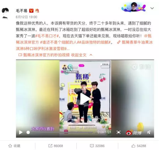 毛不易本尊也发布微博 “像我这样优秀的人,本该拥有带货的天分,终于二十多年到头来,遇到了细腻的甄稀冰淇淋。”前后反差的魅力值,提升了话题度,带货力满分,甄稀冰淇淋的“细腻”魔力,更是在毛毛的妙语连珠中,呈现的淋漓尽致。