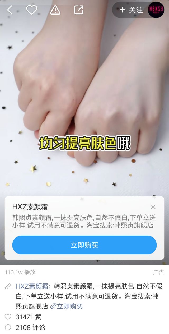 女生化妆时间一般要多久?新零售营销 这是一个来自灵魂的拷问 对于直男的回答:女生化妆超级烦,化个妆都要一个小时,磨磨唧唧,有时候就想薅起来就走,真心受不了! 额......对于这种回答,精致的猪猪女孩恐怕就要上拳头了。 但是化妆真的慢吗?那可能是没有找对化妆方式,没有用对化妆品,刚刚小编在快手广告看到一条化妆品的广告,广告主是韩熙贞(HEXZE),推荐的产品是素颜霜,一起来看看广告案例,顺便学学化妆的简单方法! 广告封面图使用产品图,以一个推荐者的身份亲测为用户安利一款素颜霜,素颜霜可以说是懒人神器,相信化妆很长时间的女孩纸会非常感兴趣。