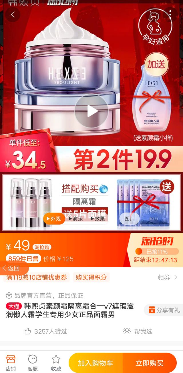 点击广告进入视频页,视频页的内容有现场亲测的素颜霜效果,从手开始大概可以看一下效果,然后开始面部上妆,重点展示素颜霜的遮瑕效果,懒人或者时间紧急的时候可以用了水乳之后直接用素颜霜直接搞定繁琐的化妆问题,3分钟搞定。从的角度看主要展示的素颜霜的特点有: 1.遮瑕效果Very Good! 2.可以提亮皮肤 3.节约化妆时间