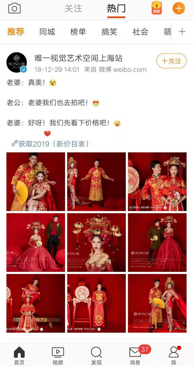 突然发现有一段时间没有分享过婚纱摄影行业的广告了,今天刚好在刷微博的时候看到了唯一视觉投放的微博的广告,这次和以往不同,这次推广的优惠比以前的优惠更大,唯一视觉集团15年周年庆,目前正在大幅度搞活动,你确定不进来看看别人的店庆活动是如何做推广的吗? 看到唯一视觉就想要收集一些唯一视觉的新知识方便本编创作,当我社交媒体时代的危机公关搜唯一视觉的时候排名第一的就是唯一视觉的官网,而官网的封面图时邓伦,以前来唯一视觉的时候还没发现邓伦是代言人,这次可不一般啊,恭喜邓伦喜提唯一视觉品牌形象代言人。 话不说这么多,先看看唯一视觉投放的微博粉丝通广告案例有哪些变化吧! 广告文案使用伊对夫妻对话的形式吸引用户注意,对话表明,不仅女生喜欢漂亮的婚纱照,男生也非常喜欢的呢,惹得男女都爱的换啥找,用户会不心动吗? 广告配图使用九宫格的形式,使用的是同风格的婚纱但是不同造型的婚纱照。色调、风格都统一更能吸引用户,而且不会造成眼花缭乱的感觉。