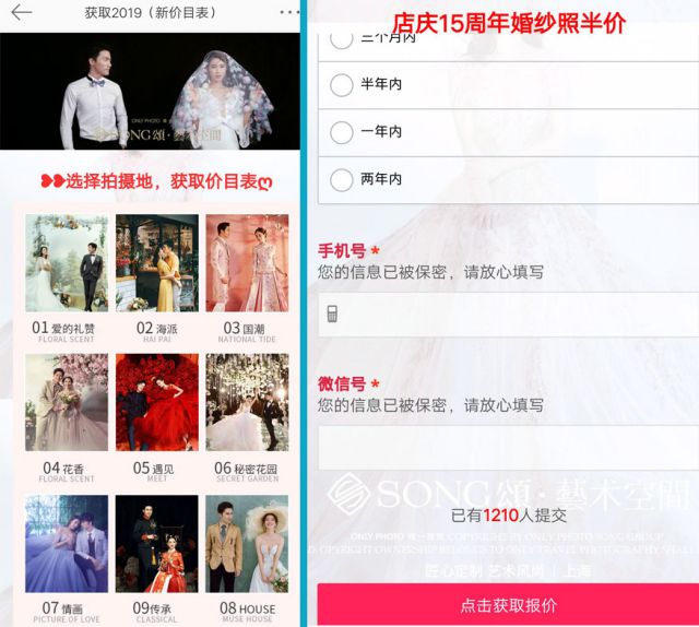 广告文案引导用户点击广告跳转至落地页,所以点击文案中“获取2019新价目表”就可以跳转到广告落地页了。 落地页的内容跟以前的内容差不多,不过这次广告的落地页用户可以选择拍摄地,每个拍摄地都有一个浪漫的名字,二位不同拍摄地的名字是不同风格的换啥找(看起来都漂亮,小编都想要),这么漂亮的换啥找对于用户来说可能也是难以抉择,单看不同风格的婚纱照就非常有吸引力了!