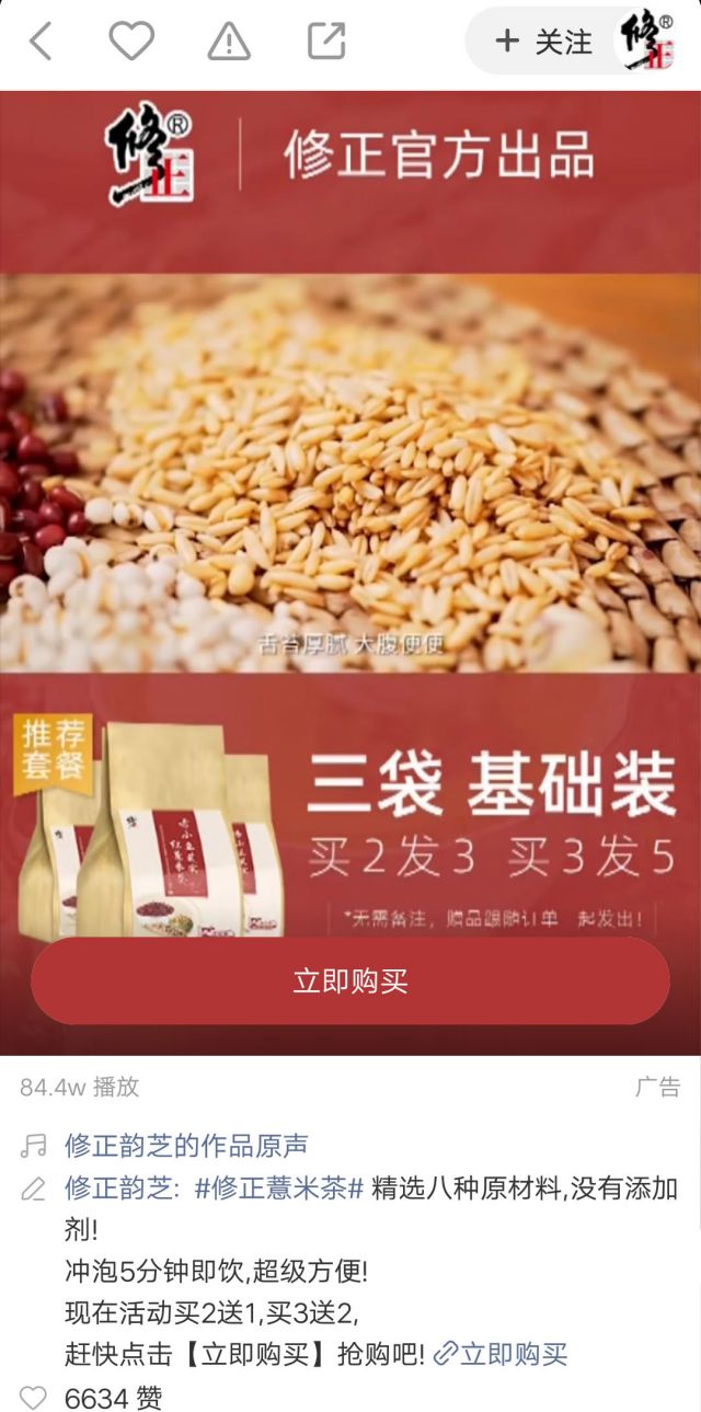 修正的产品想必大家都非常熟悉了,也算是老品牌了,这次修正推出祛湿系列的产品,我们都知道,身体湿气太重对健康的影响还是蛮大的,例如伤害关节、引起肥胖、浮肿以及女性的一些妇科疾病等。 对于祛湿气的办法当然最普遍的说法还是要有一个好的生活习惯啊,除此之外还可以通过饮食来调整,总之还是要科学祛湿。 修正推出的祛湿产品相对来说还是非常值得尝试的,毕竟修正的口碑也是人尽皆知的。 此次修正推出祛湿产品,用户可以冲泡之后饮用,可以看看修正投放的快手广告。