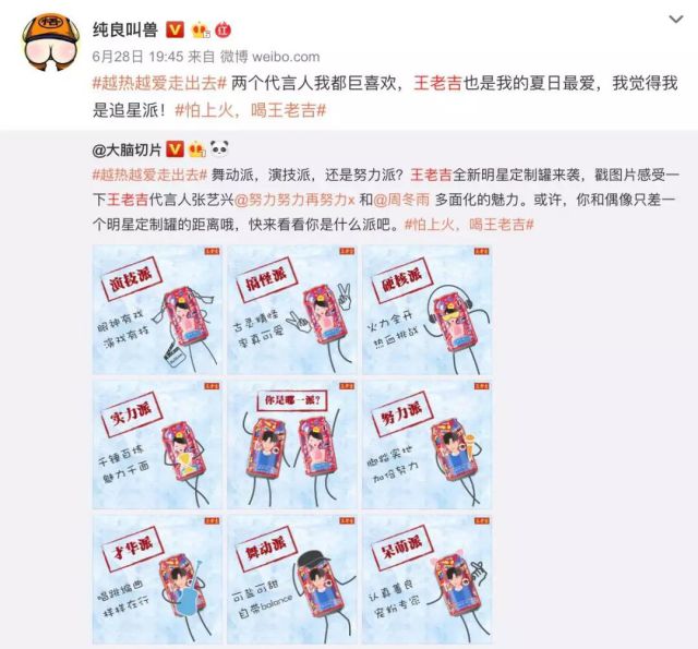 一方面,直接带动了定制罐销量的攀升,晒单热潮持续火热;另一方面,这也让王老吉与张艺兴之间形成了深度绑定,在粉丝心中建立起王老吉的优质品牌形象,进一步俘获了粉丝的心,实现了口碑、销量与流量的同步飞升! 2.粉丝自发生产 明星定制罐原来这么好玩儿 王老吉首度大规模公开发售明星代言人定制罐,就在粉丝群众掀起了一股“二次创作”浪潮。粉丝和网友脑洞大开,分别借助张艺兴和周冬雨的不同特点,制作了一系列有趣好玩的表情包、创意海报等等,实用度、创意度和美观度都十分高,在粉丝群众的传播度居高不下,更是成为各类社群中一时之间疯狂交流的“硬通货”,获得了粉丝群的喜爱,也让王老吉的品牌形象愈发深入人心。 其中最为有趣的莫过于张艺兴超话粉丝大咖@w7yxxxxx_ ,她做了一组超级可爱的表情包,张艺兴化身小兔兴,软萌到炸。“老板,来一箱”、&ldquo网络营销的渠道;你这么这么好看”,无一不是粉丝最真挚的心情写照! 除此之外,知名段子手@大脑切片 还分别结合张艺兴和周冬雨的特质,自制了一组定制罐创意海报。 演技派、搞怪派、硬核派、实力派、努力派、才华派、舞动派和呆萌派,不但在粉丝群体中掀起了“你是哪一派”的热议,更引发了其他段子手的踊跃扩散,@纯良叫兽、@我的偶像巨顽皮、@表情专辑 等化身自来水,让更多网友pick到了王老吉明星定制罐的可爱!