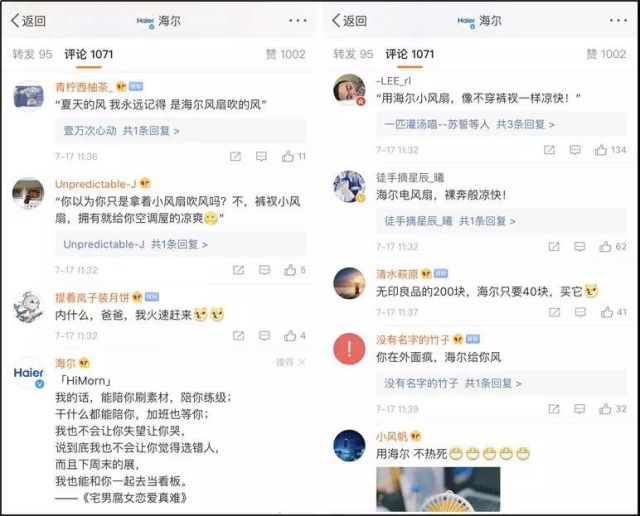 以下这些带货文案,就是海尔兄弟官微亲自翻牌的。每一句文案,都自带“裤衩”的形状,看完不止清凉一点点。只能说,这届网友脑洞真大!