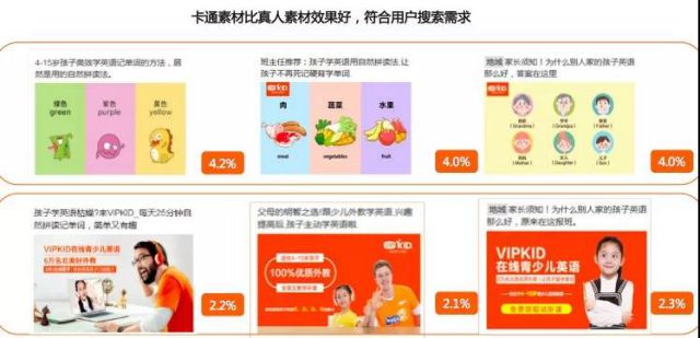 本篇给大家分享两个教育培训行业信息流投放案例,广告主投放可参考。 案例一:在线英语教育 百度信息流好看视频投放案例分享-VIPKID在线青少儿英语,先看投放数据:线索成本200元 ACP1.3元 推广产品:青少儿在线英语教育 投放资源:百度信息流-好看视频 投放背景:VIPKID市场占有率、口碑度和认知率虽处于行业领先,但是随着竞争激烈,品牌面临增量和效果的双重挑战 投放目标:① 新产品测试 ② 人群深度对接,增加新用户覆盖 ▋投放方案: 1、第一阶段,账户设置时间预算,合理推广 ① 定向设置:30-40岁,女,以一线城市、发达城市为主;意图词以品牌词、竞品词为主,通用词为辅;兴趣选用与女性相关的兴趣,如:教育、购物、娱乐等; ② 素材测试:卡通素材比真人素材效果好,符合用户搜索需求。如下图所示,同样的广告语,真人素材CTR2.1-2.3%,卡通素材CTR4.0%-4.2%;