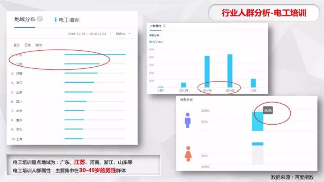 行业人群分析:电工培训重点地域为:广东、江苏、河南、浙江、山东等;电工培训人群属性:主要集中在30-49岁的男性群体