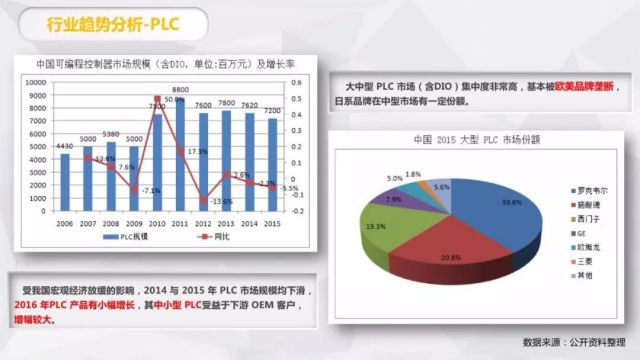 2、PLC培训: 行业趋势分析:受我国宏观经济放缓的影响,2014与2015品牌营销方案年PLC市场规模均下滑2016年PLC产品有小幅增长,其中小型PLC受益于下游OEM客户,增幅较大。大中型PLC市场(含DIO >集中度非常高,基本被欧美品牌垄断, 曰系品牌在中型市场有一定份额。