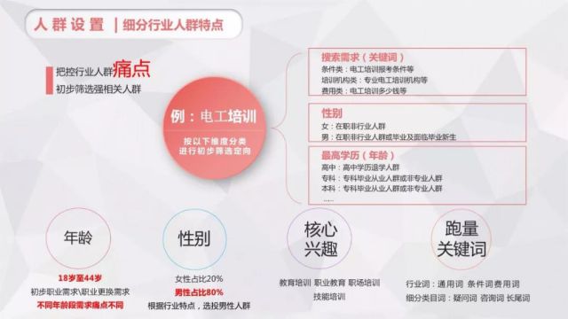 ▋投放效果: 通过三个阶段的逐步深入优化策略,使用原生意图词,意图标签等功能,测试新广告资源、好看视频,通过测试为广告主增加了大量数据,大幅降低成本,提升点击率,带动教育行业在百度原生上预算以及效果的提升。 案例二:职业培训 广告主是一所新型职业学校,拥有社会力量办学资质,是苏州市外来务工定点培训机构,在校学员符合相关条件可申请各类政府补贴,部分培训课程可享受政府全额补贴。 培训业务主要分为:电工培训、PLC培训、工业机器人培训三方面。 电工培训:主要面向人群:18-44岁男性群体 PLC培训:主要分为西门子+三菱培训课程。 工此机器人培训:四大家族品牌:ABB、库卡、安川、FANUC机器人 广告主日预算200,仅推广苏州地域,转化线索成本希望控制在100以内。 ▋市场分析 用户需求:培训课程时间是否灵活?培训地点是否方便?培训价格是否合理?培训师资是否专业? 1、电工培训 行业趋势分析:通过百度指数可以看出,电工培训行业搜索高峰期集中在9月份、10月份,低谷期在2月份,一年检索趋势相对比较稳定;电工培训行业资讯关注度逐年上升。