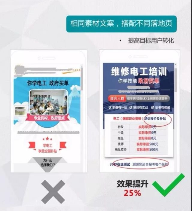 落地页优化: 头图:突出行业痛点+业务卖点,优惠信息、产品服务简短介绍、品牌slogan等。例:政府补贴,课程内容完善,培训品牌有保障 页面中部:具体业务介绍,可陈述培训流程, 培训课程分类,师资团队等 表单:头图之下,页面尾端。头图表单可结合头图内容设置引导式表单,例:测试是否符合报考条件。表单选项:根据表单类型设置对应选项,表单手机号(体现已加密),给用户心理安慰。 ▋投放数据: