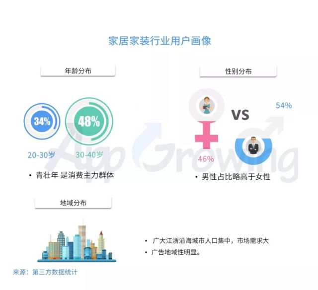 那么,家装家居行业移动广告又是如何促动用户决策的?整体的行业广告投放呈现怎样的趋势?都有哪些广告创意点? 本文将以App Growing所追踪到的9月份家居家装行业移动广告情报为依据,解析家居家装行业的广告投放密码。 一、家居家装行业整体用户概览 1、家居家装行业用户画像 根据第三方的调研数据显示,家居家装行业的用户集中在21-30岁,30-40岁的青壮年人群,男女比例相对均衡。相对而言广大江浙沿海城市人口集中,市场需求更大,另由于用户更信任本地商家,家装家居行业整体广告地域性也较为明显。