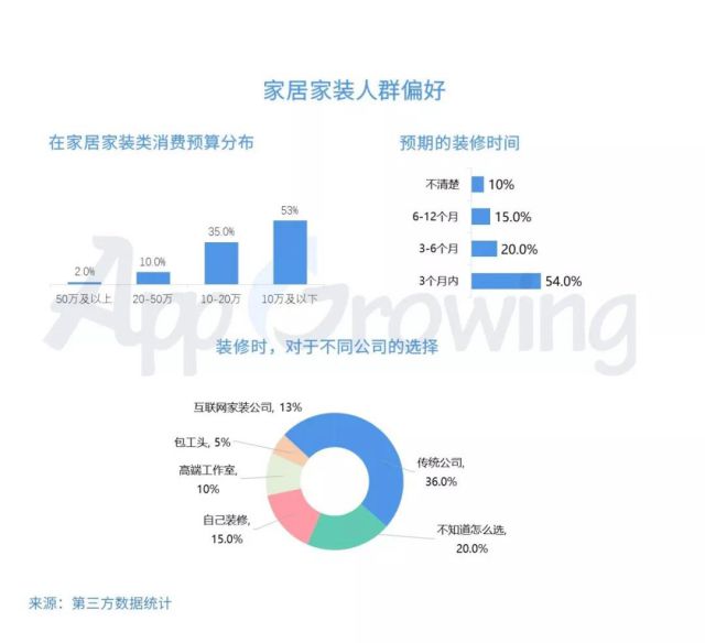 2、家居家装行业用户偏好分析 53%的家居家装用户的预算(涵盖家具费用)分布在10万及以下,而家居家装预算在20万及以下的用户占比超过88%。而用户更愿意花费3个月以内安排装修,占比超过54%。传统公司依然是最主要的选择,占比36%,互联网家装公司逐渐崭露头角,有13%的用户会考虑选择互联网家装公司。