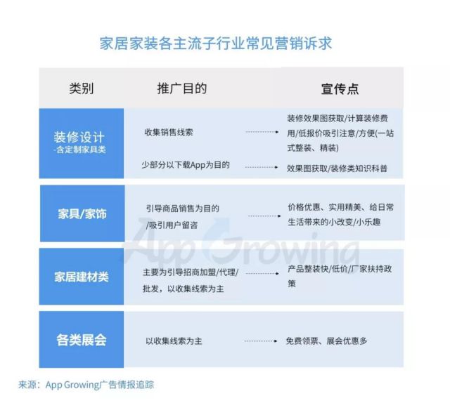 三、不同细分行业广告创意分析 整体而言,可将家居家装行业划有名的电视广告分为装修设计(含定制家居类)、家居/家饰、家居建材类、各类家居家装展位等,相关的营销诉求整理如下。