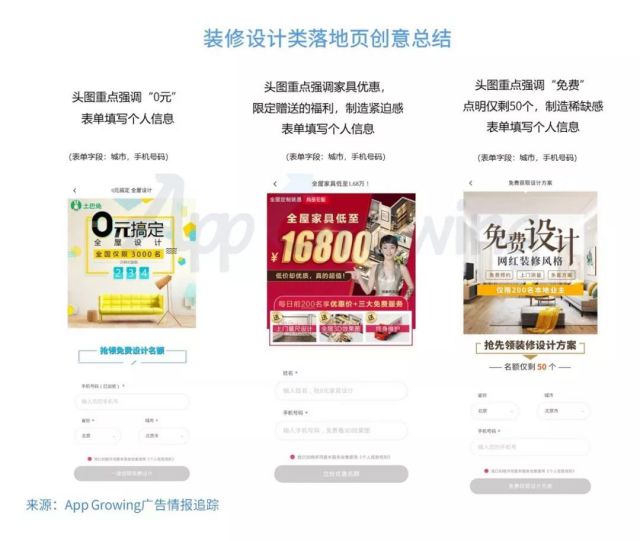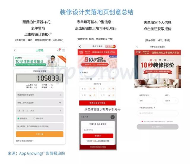 在视频广告创意方面,装修设计类广告主要有以下6个创意点: 纯效果图图片剪辑 效果图剪辑展示搭配字幕呈现品牌优势 从毛坯到精装修,装修进程效果视频剪辑 由装修业陷阱或痛点引入,展示品牌特色 采访式问答引入,类似电话销售广告类风格 长镜头移动,360度充分呈现样板房 而家装家居类App则不同于传统的家装公司,视频广告会更注重推广一键报价及家装小常识。 以住小帮为例,其9月份89.5%的广告为视频广告,视频广告创意主要有以下两类: 通过各种情景喜剧,体现装修价格效果好,价格便宜,进一步引出下载App一键查看装修报价。-如切入新装修不知道怎么入手,邻居/朋友家/同事推荐等 以装修常见的痛点问题入手,科普相关的知识,从而引出“装修类”社区,提供装修攻略,装修案例等 落地页方面,主要分为获取报价类及获取免费设计方案类这两种类型。 获取报价类,重点体现“免费”“点击获得明细/计算”,落地页流程大概为:提示填写表单——优势介绍-再次提示填写表单。