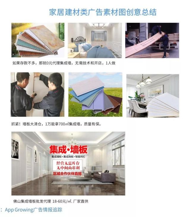 2、家居建材类广告投放分析 家居建材主要以招商加盟、招募代理为主,广告文案主要有以下3大宣传点: 1)厂家扶持政策,门槛低,主要表现为免代理费,无需库存,先销后算,无需门店、到厂考察报销路费这几点。 自贡集成墙板8-10元/㎡ 送货上门 先销后结 遵义墙板不要加盟费,18元/㎡批发价,免费铺货,2人可做! 2) 低价,折扣高 驻马店墙板厂家直销,5-10元/㎡起批,大型工厂,免费配送到家! 抓紧!本地集成墙板2折起拿货,厂家拿货无中间商,免费拿样。 3) 项目高价值及潜力,如体现建材整装周期短 装修板材批发,每平12元,先销后算,7天快装环保无醛 装修工人用了它,7天装好一套房,论速度只服集成墙板,赚钱快 在素材方面,家居建材类广告素材图新店营销推广主要由建材照、厂房照、施工现场图、整装后效果图四大元素单独或组合呈现。