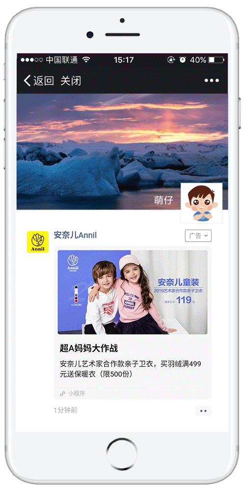 林清轩朋友圈广告示意 点击广告任意位置,即可进入小程序商城落地页。小程序首页设计为“11.11”囤货狂欢季活动海报,活动以“预售+专享礼+到店自提+187元自提礼”为主要形式,多重好礼的预售活动,吸引用户点击下单购买。 11月1日,林清轩旗下的明星产品山茶花润肤油在微信小程序开启预售后,上线短短2小时即创造了2万瓶销量。 安奈儿投放案例 亲子温情吸引宝妈 小程序会员激励二次复购 节日营销,品牌可以借力亲子温情,吸引宝妈,提升人气;会员制一定程度上可以延长用户生命周期、提高用户粘性,成为品牌的私域流量。 “双十一”节日营销,安奈儿童装大打亲子牌,吸引年轻妈妈在朋友圈为自己的小孩购买秋冬服饰。广告外层采用大卡片样式,一对萌娃模特跃然眼前,吸引目标家庭用户关注;标题“超A妈妈大作战” “合作款亲子卫衣,劲爆价格119元” “限500份”,凸显亲子温情与超高优惠,刺激妈妈用户点击下单购买。