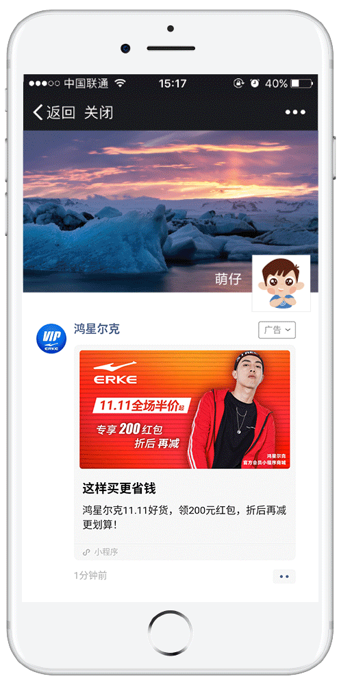 美特斯邦威朋友圈广告示意 广告内层采用小程序作为落地页,为提高小程序曝光,美特斯邦威开展拼团、砍价活动,选取品牌爆款服饰,吸引用户点击;“0元拼团”活动,刺激用户购买、分享,为美特斯邦威的小程序商城带来新的用户,提升品牌销量。 为了进一步提高广告转化率,美特斯邦威兴趣标签选择资讯控、休闲控、家居控等,年龄选定19-35岁对品牌有一定认知的年轻用户。 鸿星尔克投放案例 落地页直达小程序购买 超高粘性复购率高 鸿星尔克的广告外层同样采用大卡片样式,突出11.11优惠活动和专项红包,吸引用户点击。 用户点击广告外层即可进入小程序商城落地页,鸿星尔克在小程序商城首页设置静态的优惠券,“11.11全场半价”,满299减20,满399减30,多种优惠组合,吸引用户领券浏览商品详情。同时,随着用户向下滑动浏览,商品详情页上的每个商品均显示专门优惠直减金额,吸引用户下单购买。
