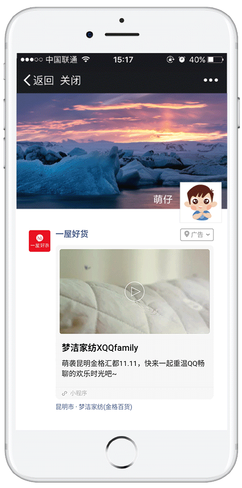 森马朋友圈广告示意 森马朋友圈广告外层采用大卡片视频样式,视频详细介绍森马特色单品智能加热羽绒服,提升用户好感度和购买率;点击进入落地页小程序商城,代言人白宇的高清海报猛烈吸睛,吸引用户下单购买; 同时,森马公众号文章推送与朋友圈广告投放紧密联动,同步推送关于白宇身穿同款羽绒服的推文,并在推文中加入小程序跳转按钮,将阅读文章的粉丝引流到小程序商城下单。内容与广告投放联动,让关注公众号的会员沉淀为森马的私域流量,扩大品牌流量池。 梦洁家纺投放案例 IP联名+定位打点推广 圈定区域客源 随着IP越来越热,品牌可以借力热门IP联名招徕客流。同时,微盟建议品牌采用创意视频进行营销推广,获取用户的品牌好感度并提高转化。 好的产品需要找到有需求的消费者,梦洁家纺通过朋友圈广告邂逅喜爱梦洁白鹅绒棉被的年轻人。 通过本地推广的自定义打点辐射功能,将推广定位在昆明市主要区域,配合线下商超巡场落地活动,保证线下引流的精准性;年龄定向25-45岁的单身、新婚、已婚群体;外层文案“萌袭昆明金格汇都11.11”并且在卡片下方标出门店位置,为门店吸引精准客流。