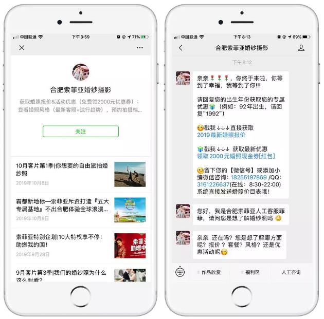(广告外层示意) 尤其是在今年十一假期的热点推广中,广告主更是以“素人生活照”搭配精美客片作为广告外层有没有个人小程序做的好的,采用上下排列的六宫格轮播形式,3张精美样片+3张生活照,以甜蜜的恋爱氛围为核心,融合温馨、自然的艺术风格,广告外层图的相应调整增加视觉活力,更让用户感同身受,增加代入感,广告点击率高达5%。 沉浸式落地页引导用户关注 公众号运营构建流量“蓄水池” 用户在选择婚纱摄影类产品时,消费决策周期相对较长,如何在此期间保证用户的留存和活营销渠道策划方案跃度,加快决策转化,是索菲亚婚纱摄影需要解决的重要问题。 “我们希望将索菲亚打造成安徽婚纱摄影品牌的第一名,所以,在广告推广中不仅期待有充分的品牌曝光,更希望沉淀属于我们的忠实用户。”运营总监表示。 因此,索菲亚的广告落地页采用文字+图片的混排形式,打造沉浸式体验,当目标受众在朋友圈看到索菲亚的广告投放时,点击外层6宫格,可直接抵达原生落地页,增加用户的触达量,提高用户体验感。